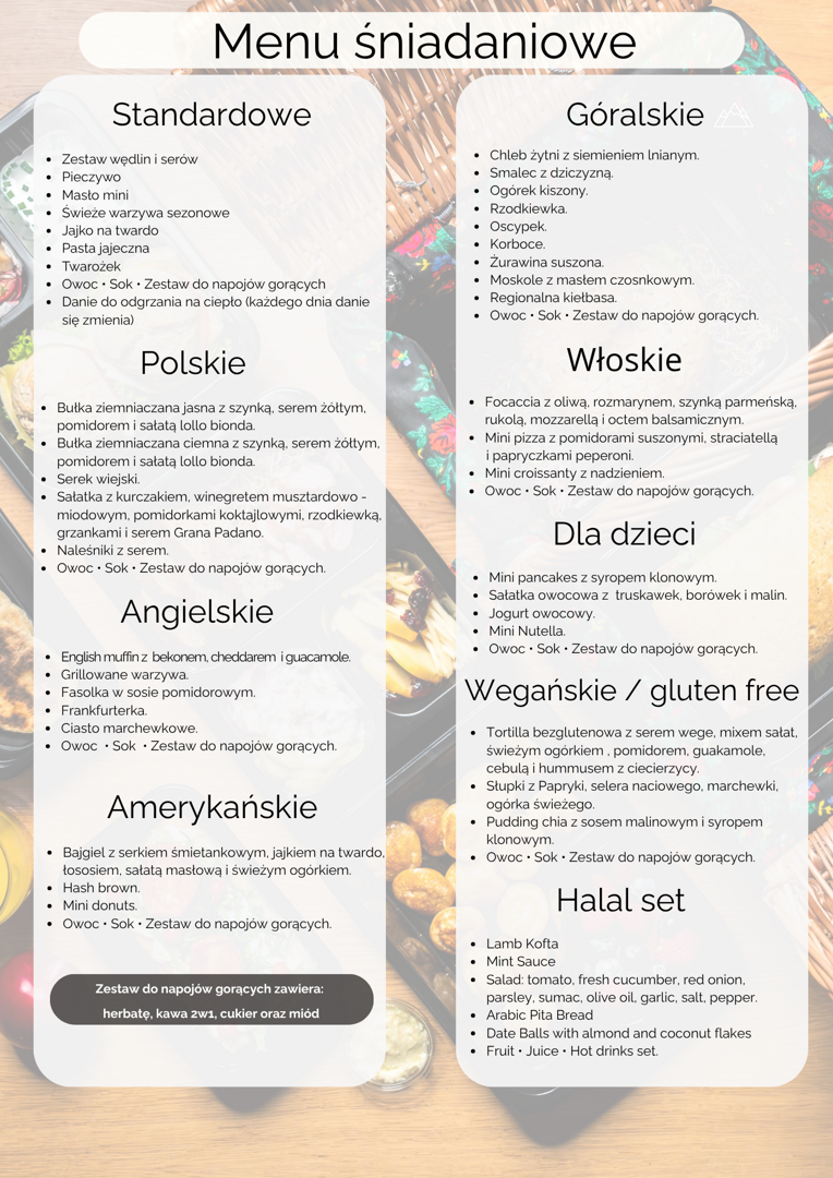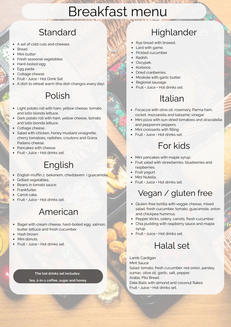 Za jedyne 50 zł od osoby możesz cieszyć się świeżym, pysznym śniadaniem bez wychodzenia z apartamentu. Wystarczy złożyć zamówienie do godziny 18:00, a śniadanie będzie czekać u Twoich drzwi o godzinie 8:30 następnego dnia!